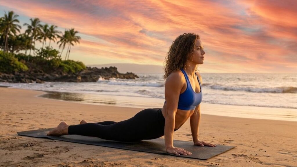 Locust Pose targets the lower back, glutes, and core muscles. Lie face down and lift chest, arms, and legs off the floor. Keep the core tight and legs active. Hold for 20โ30 seconds to improve posture and spinal support.
